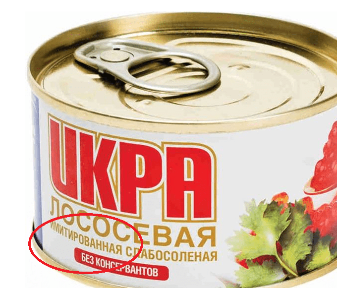 3. Изучите этикетку. Честные производители на упаковке с ненастоящей икрой так и напишут: “имитированная”. Такая икра по внешнему виду и вкусу часто не будет отличаться от натуральной. Это официальная, качественная подделка. Но имитация не обладает всеми полезными свойствами оригинала.