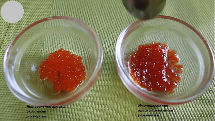 Важным различием будет цена — искусственная икра стоит меньше 100 рублей за 100 граммов.