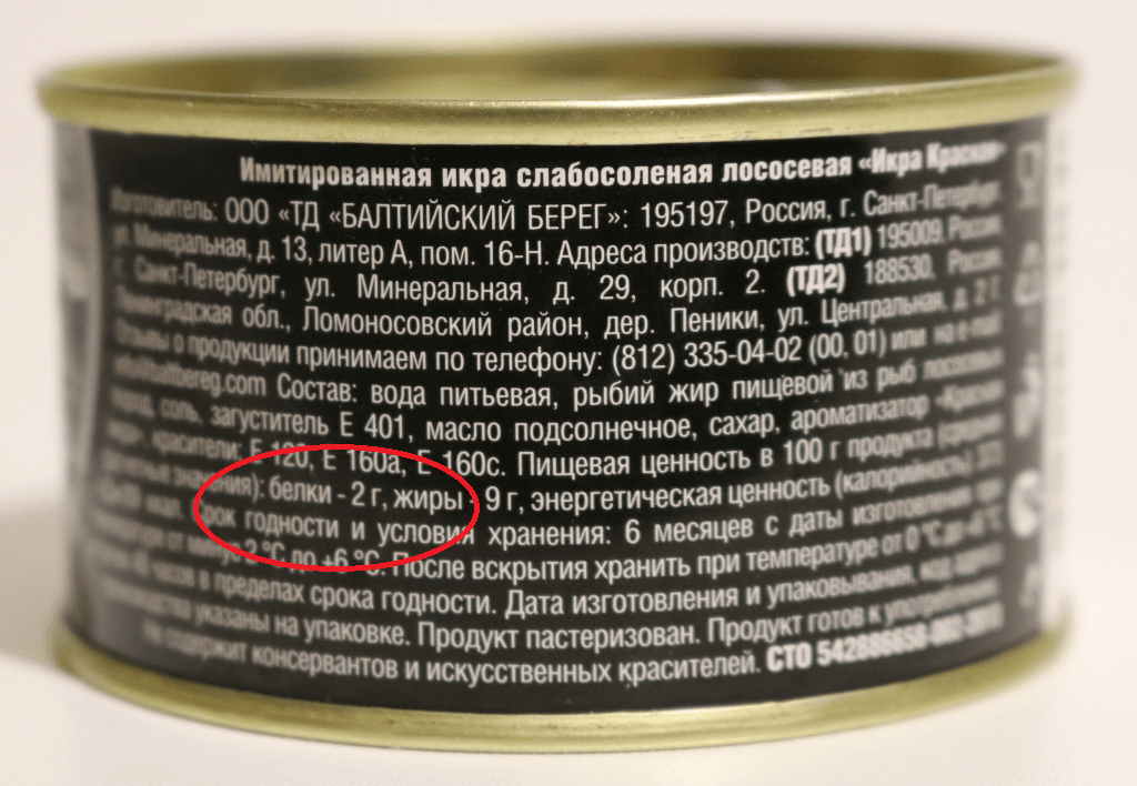5. Прочитайте состав. Настоящая красная икра содержит 15 – 32% белка, что и должно быть обозначено на упаковке. Имитированная – производится из водорослей, рыбного бульона или рыбьего жира. Белка в ней совсем мало – около 2% – или вообще нет. Что тоже указано на упаковке.