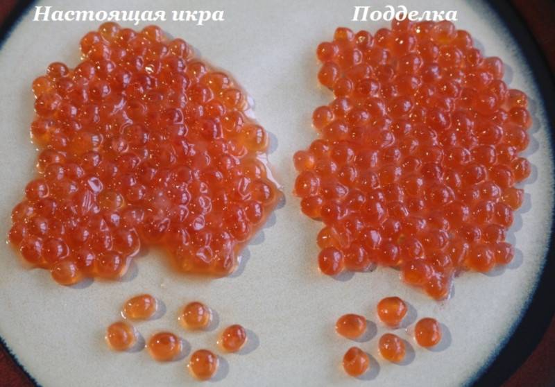 Более коварный ход — представить имитацию икры за натуральную. Суррогат — правда, в лучшем смысле этого слова — давно и прочно обосновался на полках магазинов. Имитация сушеных и измельченных морских водорослей с добавлением рыбного бульона, ароматизаторов и красителей (древесный уголь, экстракт паприки). Смесь капают в раствор хлорида кальция, и получаются шарики с органолептическими свойствами настоящей икры. Съесть продукт из-за повышенного содержания йода и низкой калорийности можно и даже полезно, но не из настоящего ценного морепродукта.
