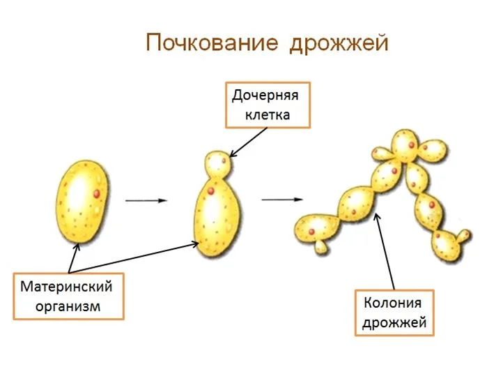 Такой способ размножения грибов как почкование характерен в основном только для дрожжей. У дрожжевой клетки образуются один или два выступа, которые постепенно увеличиваются и превращаются в клетки. Так получаются цепочки дрожжевых клеток, каждая из которых способна создавать новые организмы.