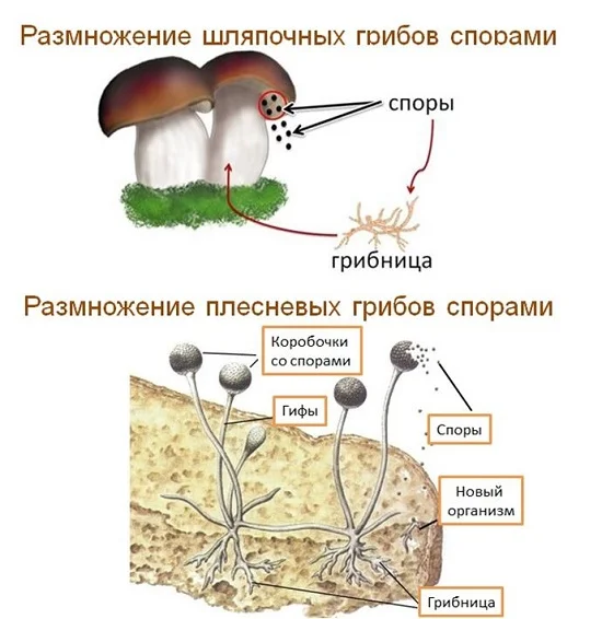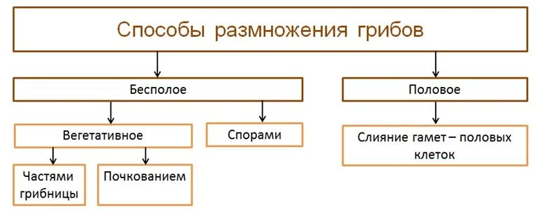 Размножение грибов может осуществляться несколькими способами: бесполым и половым.