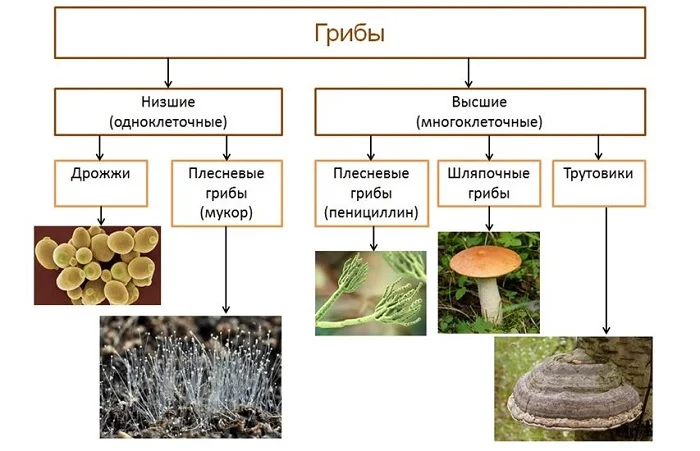 Остановимся подробнее на особенности строении грибов. Можно выделить две группы этих организмов: низшие (одноклеточные) и высшие (многоклеточные).