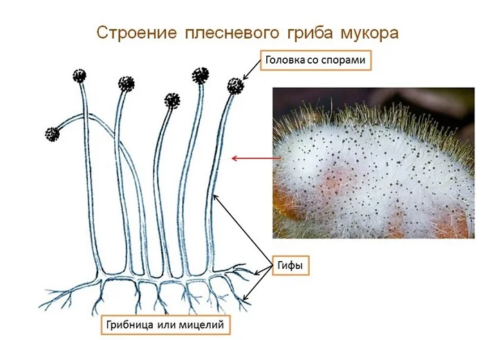 Строение мукора похоже на другие грибы: у него есть гифы – тонкие нити, которые служат для поглощения питательных веществ. Гифы также нужны для размножения гриба, так как на их концах образуются споры.