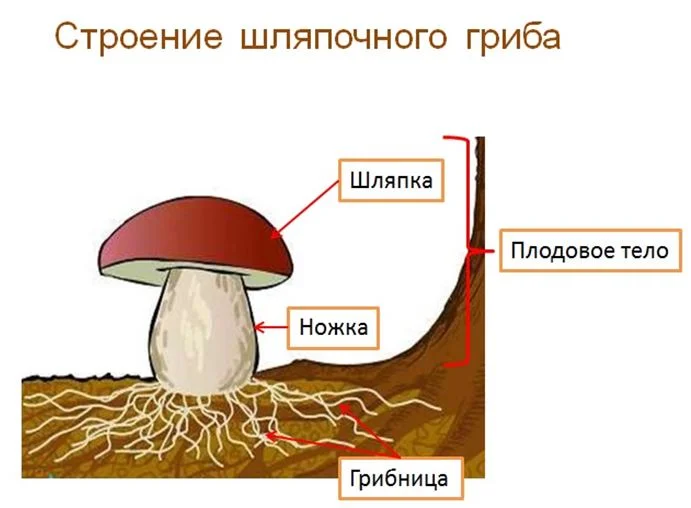 Всем хорошо известны шляпочные грибы, остановимся подробнее на их строении. Грибом мы называем шляпку и ножку, однако, все вместе это плодовое тело шляпочного гриба. В почве скрыта грибница, состоящая из длинных ветвящихся нитей, расходящихся во все стороны. Гифы разделены перегородками на множество клеток, расположенных в один ряд. Поэтому шляпочные грибы относят к многоклеточным. Тело шляпочного гриба также состоит из ветвящихся белых нитей – гифов.