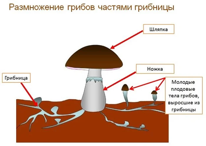 К бесполому способу относится размножение частями грибницы, характерное практическидля всех видовгрибов. Как мы уже знаем, грибница состоит из длинных многоклеточных нитей, которые находятся в почве. Эти нити ветвятся в разные стороны и из них могут вырастать новые плодовые тела грибов.