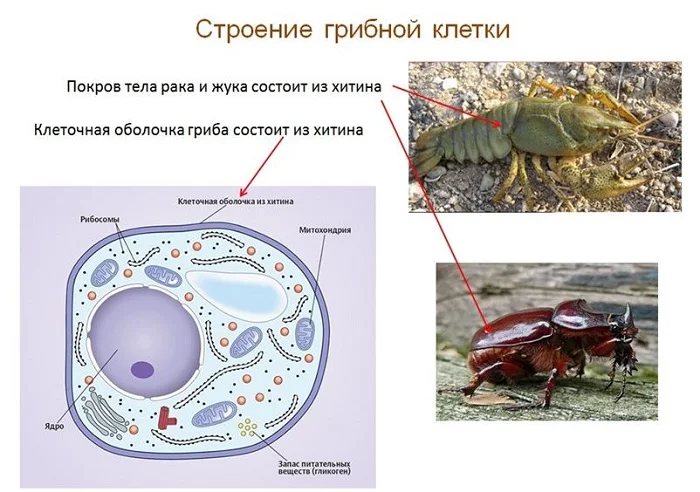Основой строения грибов, как и любых других организмов, считается клетка. Ее строение схоже с животной клеткой. Оболочка содержит вещество – хитин, который присутствует в панцире ракообразных и насекомых. Также характерно отсутствие хлорофилла – зеленого пигмента, характерного для растений.