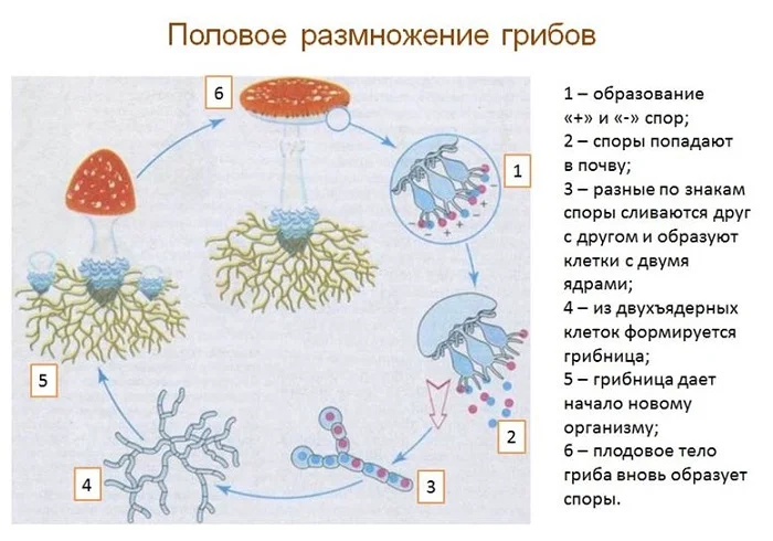 Половое размножение грибов представляет собой сложный процесс. Познакомимся с ним на схеме.