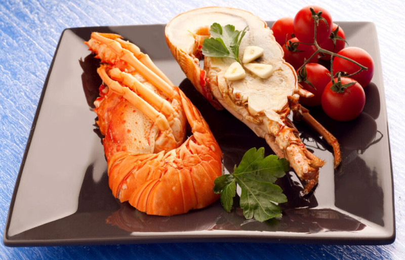 Лангуст – более утонченный собрат лобстера. В отличие от последнего, он имеет более длинное тело и небольшие клешни. Его достоинство – мощный подвижный хвост и длинные усы. Лапок у лангуста на одну пару больше, а панцирь украшает орнамент из шипов. Размер тела достигает 60 сантиметров в длину. Предпочитает обитать в теплых спокойных водах. Мясо лангуста считается вкуснее и нежнее, поэтому и стоит дороже. Съедобными являются хвост и брюшко. Самые изысканные деликатесы готовят из хвостов.