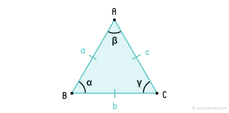 На рисунке мы обозначили стороны как a, b, c, где a = b = c. Углы обозначили как α, β, γ, где α = β = γ = 60°. Одинаковые стороны помечаются одинаковым количеством черточек. Мы пометили стороны a, b, c одной чертой. Одинаковые углы помечаются одинаковым количеством дуг. На рисунке мы все углы пометили одной дугой.