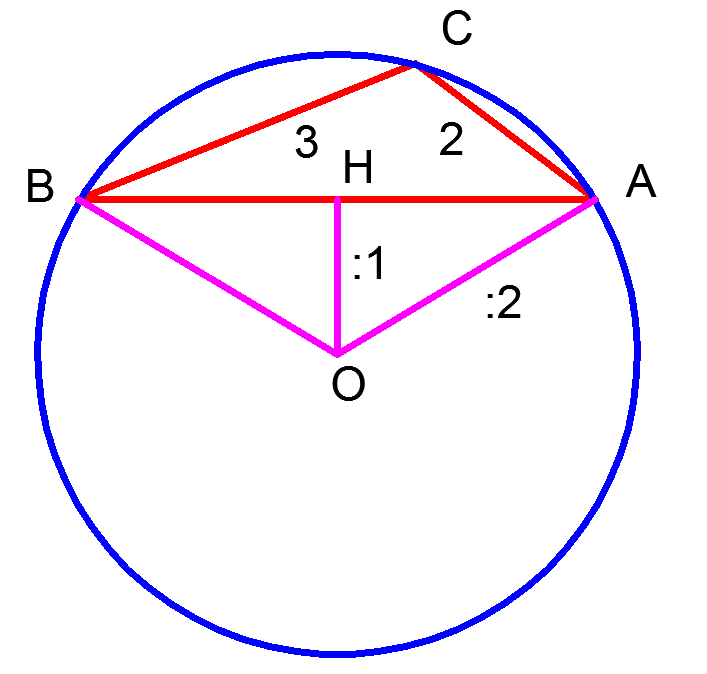 | Пример 1. Известно, что расстояние от центра описанной окружности до стороны AB треугольника ABC равняется половине радиуса этой окружности. Найдите высоту треугольника ABC, опущенную на сторону AB, если она (высота) меньше а две другие стороны равны 2 и 3.