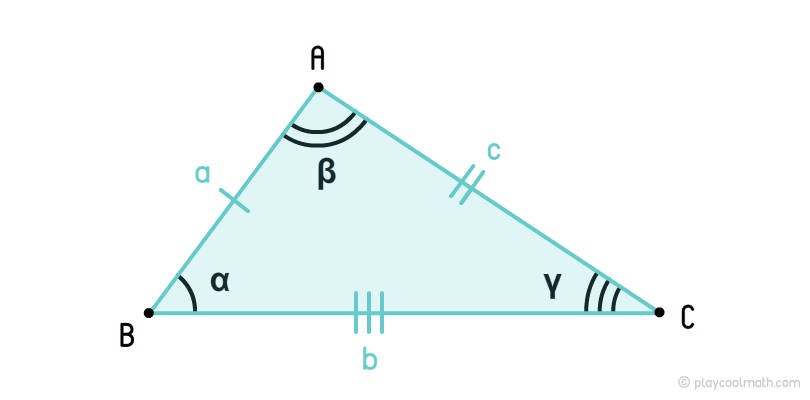 На рисунке мы обозначили стороны a, b, c, где a ≠ b ≠ c. Углы обозначили как α, β, γ, где α ≠ β ≠ γ. Мы пометили стороны a, b, c разным количеством черточек, указав что все стороны имеют разную длину. Все углы пометили разным количеством дуг, указав, что все углы имеют разные угловые меры.