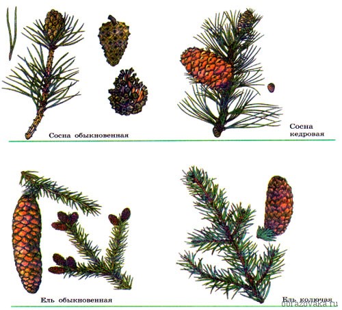 Сосновые шишки обычно небольшого размера 4–5 сантиметров, еловые длиннее – 10–15 сантиметров. В отличие от сосны, созревание семян у ели происходит осенью того же года, что и опыление. В конце зимы – начале весны они высыпаются и разносятся по окрестностям. Семена сибирской сосны (кедра) называют кедровыми орешками, их употребляют в пищу.
