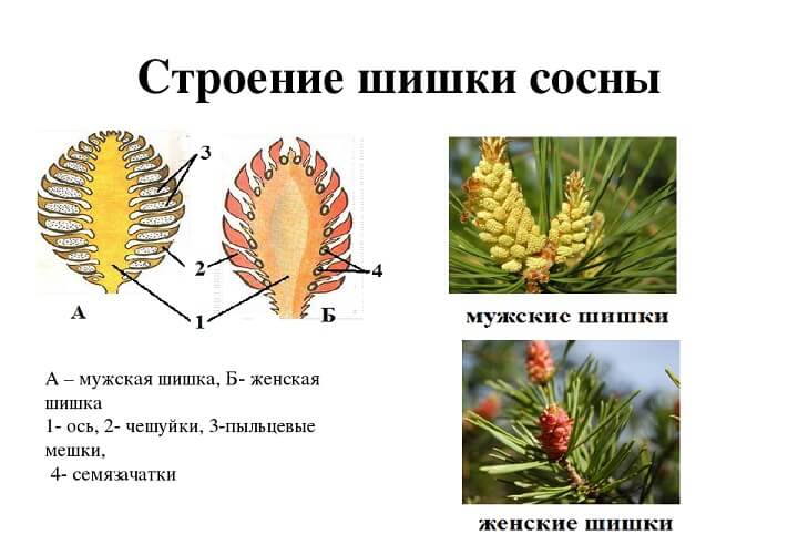 У зрелой женской шишки на месте семязачатков должны появиться семена. Мужская шишка тоже имеет стержень и чешуи, но вместо семязачатков содержит пыльцевые мешочки с пыльцой.