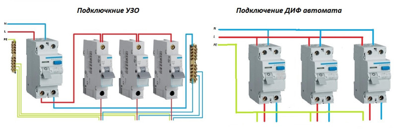 Сравнительная схема установки и подключения защитной пары и дифавтомата. Результат срабатывания в аварийной ситуации и надежность устройств одинаковая, а порядок присоединения проводов отличается