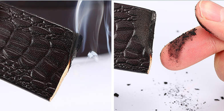 На синтетическом материале будет видна прогорающая отметина и возникнет характерный запах. Если держать огонь подольше, кусок кожи начнет тлеть и пахнет шашлыком.