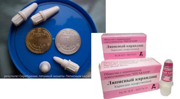 Следующий метод проверки – воздействие на изделие ляписным карандашом. Его можно купить в любом аптечном пункте. Чтобы проверить серебро, достаточно смочить карандаш в воде и провести им по металлу.