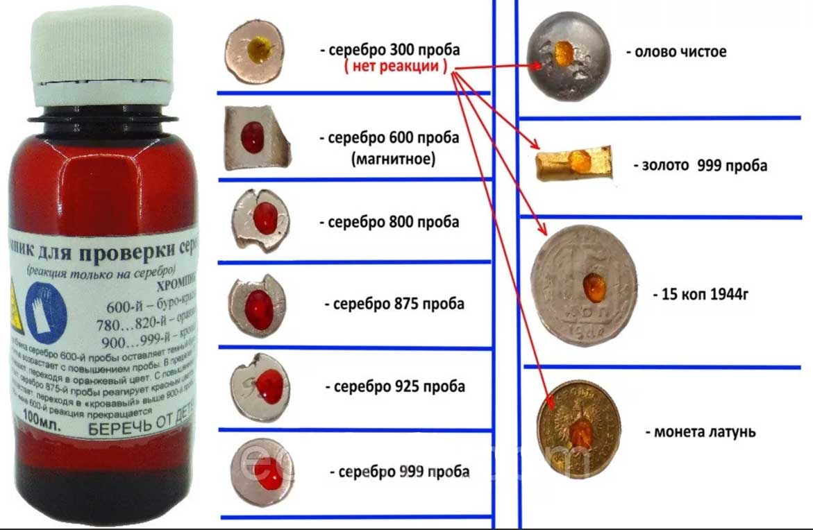 - С азотно-кислым серебром. Светло-серый цвет этого реагента на изделии покажет высокую пробу (от 750). Мутно-белый — наоборот.