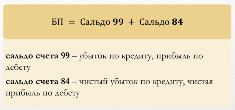 В конце каждого отчетного года поступившие средства должны быть перенесены на счет 84 (нераспределенная прибыль). Таким образом, бухгалтер закрывает счета за отчетный период. А итоговая формула расчета бухгалтерской прибыли к отчетному периоду будет выглядеть следующим образом: