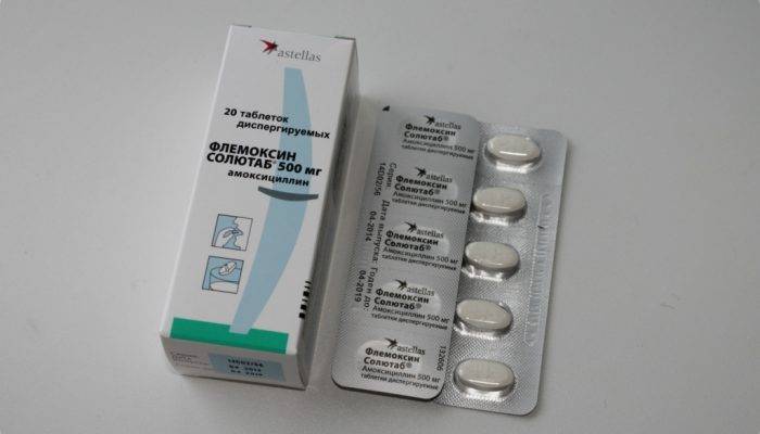 «Флемоклав Солютаб» — упаковки по 250, 500 и 875 мг амоксициллина
