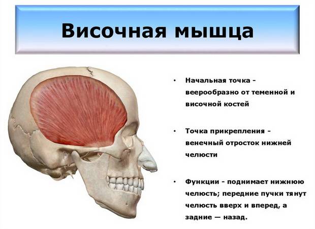 Височная мышца (m. temporalis) — самая мощная из жевательных мышц. Своим началом она занимает всю височную ямку черепа, доходя вверху до височной линии на лобной и теменной костях.