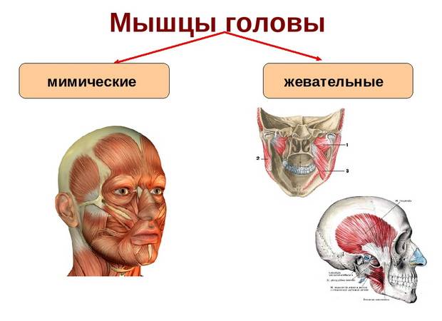 Различия в источниках происхождения по современной классифиукации обусловливают и сложную иннервацию мускулатуры головы. Так, жевательные мышцы иннервируются V парой черепных нервов (тройничным н.), мимические мышцы — VII парой черепных нервов (лицевым н.).
