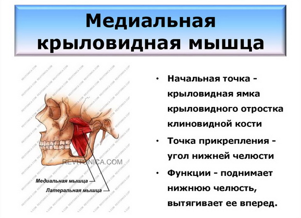 (3) Медиальная крыловидная мышца | Стенки крыловидной ямки клиновидной кости | Крыловидная бугристость нижней челюсти | Поднимает нижнюю челюсть |
