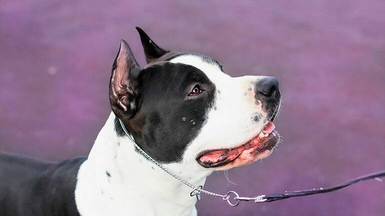 Уши – купированные или естественные, посажены высоко и широко. Амстафф с некупированными ушами будет иметь преимущество при оценке. Уши стоячие или изломленные, полностью мягкая ушная раковина – недостаток.