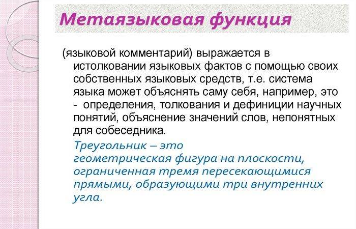 Это понятие также называют речевым комментарием. Под данным термином понимают функцию толкования языковых факторов. Применение речи в метаязыковой функции, как правило, имеет связь со сложностями речевого общения. Это может наблюдаться в разговоре с ребенком или иностранцем. Также трудности могут быть связаны со стилем или профессиональной терминологией.