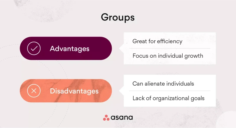 Группы поддерживают индивидуальную работу и карьерный рост, но при этом не обладают всеми преимуществами работы в команде. В числе таких недостатков — отсутствие командной сплочённости и привязки работы к целям.