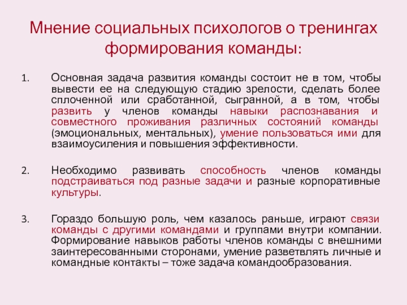Слайд 34Мнение социальных психологов о тренингах формирования команды:Основная задача развития команды состоит