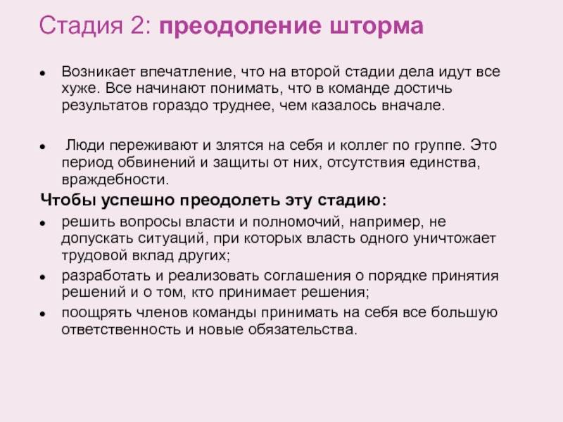 все хуже. Все начинают понимать, что в команде достичь результатов гораздо труднее, чем казалось вначале. Люди переживают и злятся на себя и коллег по группе. Это период обвинений и защиты от них, отсутствия единства, враждебности. Чтобы успешно преодолеть эту стадию: решить вопросы власти и полномочий, например, не допускать ситуаций, при которых власть одного уничтожает трудовой вклад других; разработать и реализовать соглашения о порядке принятия решений и о том, кто принимает решения; поощрять членов команды принимать на себя все большую ответственность и новые обязательства.