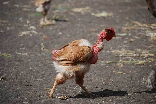 Петухи отличаются от кур формой мордочки. Она круглее, а не покрытая перьями кожа красного цвета.