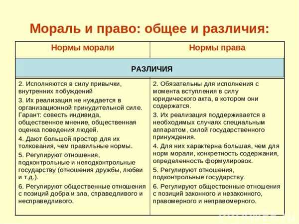 Право и мораль имеют ряд сходств и различий. Оба они направлены на регулирование поведения человека, однако, мораль основана на внутренних убеждениях и ценностях, в то время как право имеет внешнее законодательное закрепление.