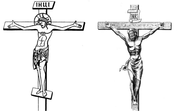 - Западные христиане (католики) изображают Иисуса измученным и мёртвым для них он — человек. Для православных Иисус — это Бог и человек в одном лице, его распятие чаще всего имеет плоскую изображение. Католики делают его более объёмным.