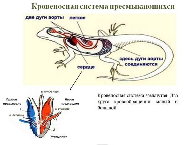Кровеносная система также во многом схожа с земноводными. Отличием является сложное строение сердца рептилий, что связано с постоянным легочным дыханием. У ящериц, змей и черепах сердце 3-камерное, а вот у крокодилов оно 4-камерное.