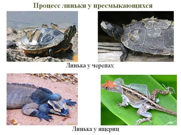 Процесс линьки может различаться у разных видов пресмыкающихся. Полностью всю кожу «сбрасывают» ящерицы и змеи. Животное трется о всевозможные предметы, и кожа сдвигается с туловища в виде «чулка».
