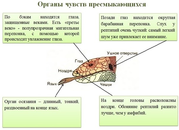 Во внешнем строении тела рептилий можно выделить три отдела: голова, туловище и хвост. У некоторых видов есть конечности с когтями – передние и задние. На голове можно увидеть различные органы чувств.