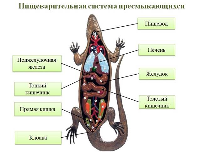 Пищеварительная система рептилий сходна по строению с амфибиями. Познакомиться с органами пищеварения можно на рисунке.
