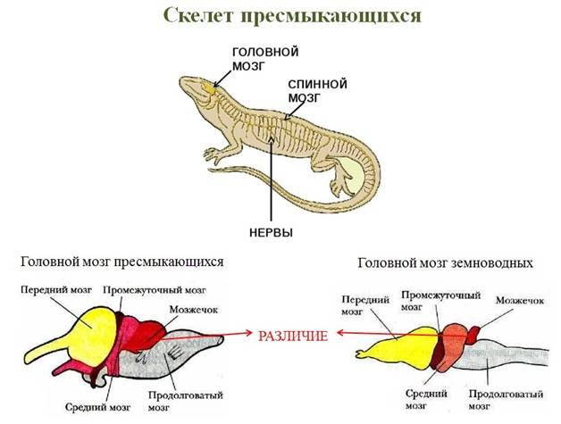 Нервная система | Головной мозг имеет сравнительно большие размеры за счет увеличения объема переднего мозга и мозжечка | Головной мозг отличается от земноводных: у него лучше развиты полушария головного мозга в переднем мозге и мозжечке, на поверхности которого имеются зачатки коры. Органы чувств соответствуют наземному образу жизни. Органом слуха является среднее ухо и внутреннее ухо. Орган Якобсона |