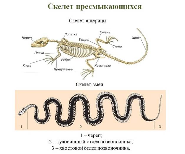 Отличительной особенностью строения скелета рептилий является большое количество позвонков. Например, у ящериц не более ста позвонков, а у змей – до четырехсот.