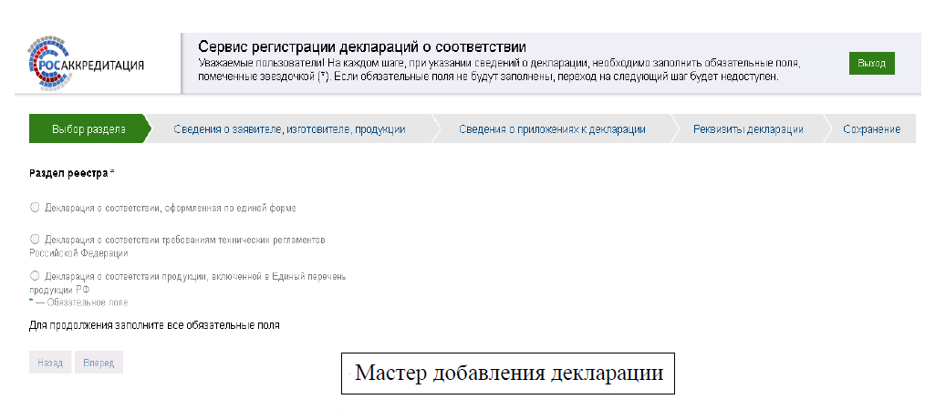 Самостоятельное декларирование осуществляется через автоматизированной «Сервис электронной регистрации Деклараций о соответствии» ФГИС Росаккредитации, через Личный кабинет портала Госуслуги с применением усиленной квалифицированной электронной подписи Заявителя.