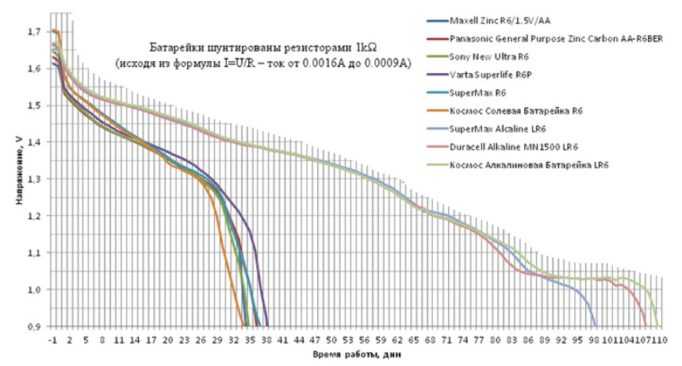 Длительность работы солевых и щелочных батареек разных производителей при одинаковом разрядном токе