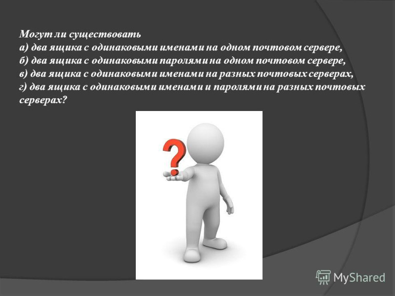Могут ли существовать а) два ящика с одинаковыми именами на одном почтовом сервере, б) два ящика с одинаковыми паролями на одном почтовом сервере, в) два ящика с одинаковыми именами на разных почтовых серверах, г) два ящика с одинаковыми именами и паролями на разных почтовых серверах?