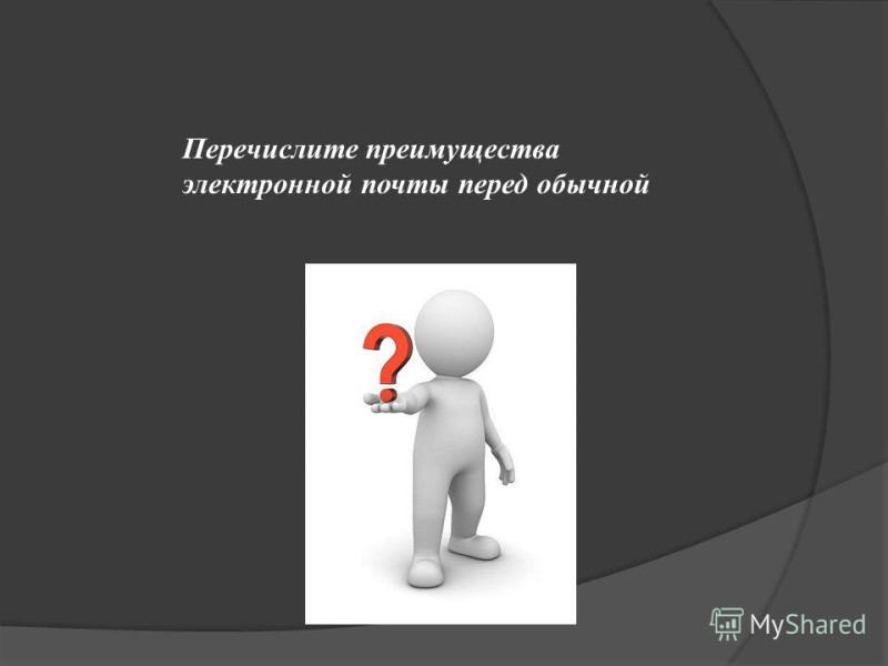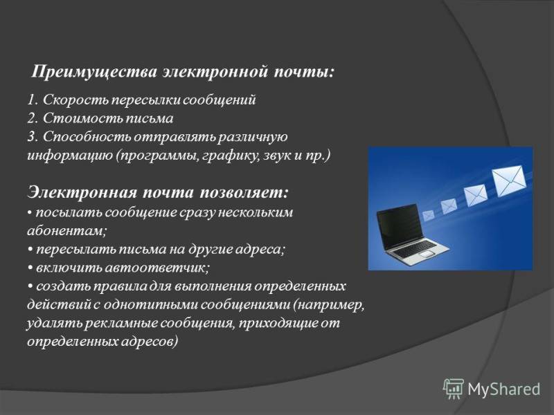 Преимущества электронной почты: 1. Скорость пересылки сообщений 2. Стоимость письма 3. Способность отправлять различную информацию (программы, графику, звук и пр.) Электронная почта позволяет: посылать сообщение сразу нескольким абонентам; пересылать письма на другие адреса; включить автоответчик; создать правила для выполнения определенных действий с однотипными сообщениями (например, удалять рекламные сообщения, приходящие от определенных адресов)