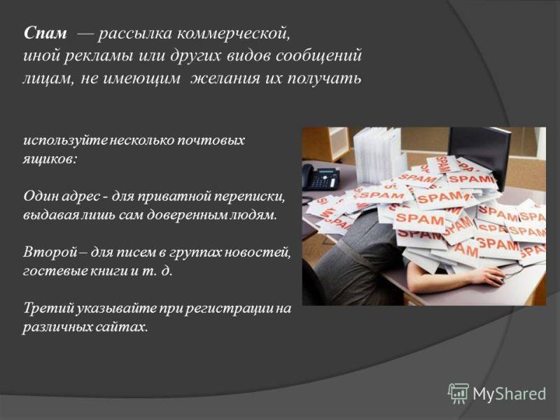 Спам рассылка коммерческой, иной рекламы или других видов сообщений лицам, не имеющим желания их получать используйте несколько почтовых ящиков: Один адрес – для приватной переписки, выдавая лишь сам доверенным людям. Второй – для писем в группах новостей, гостевые книги и т. д. Третий указывайте при регистрации на различных сайтах.