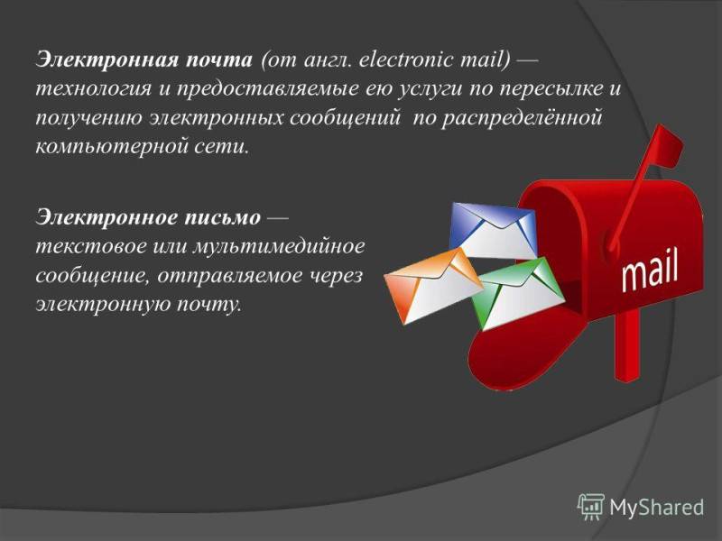 Электронная почта (от англ. electronic mail) технология и предоставляемые ею услуги по пересылке и получению электронных сообщений по распределённой компьютерной сети. Электронное письмо текстовое или мультимедийное сообщение, отправляемое через электронную почту.
