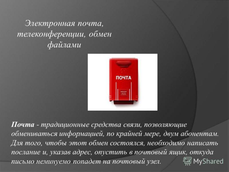 Электронная почта, телеконференции, обмен файлами Почта – традиционные средства связи, позволяющие обмениваться информацией, по крайней мере, двум абонентам. Для того, чтобы этот обмен состоялся, необходимо написать послание и, указав адрес, опустить в почтовый ящик, откуда письмо неминуемо попадет на почтовый узел.