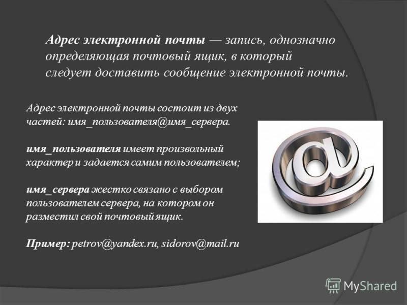 Адрес электронной почты состоит из двух частей: имя_пользователя имеет произвольный характер и задается самим пользователем; имя_сервера жестко связано с выбором пользователем сервера, на котором он разместил свой почтовый ящик. Пример: Адрес электронной почты запись, однозначно определяющая почтовый ящик, в который следует доставить сообщение электронной почты.