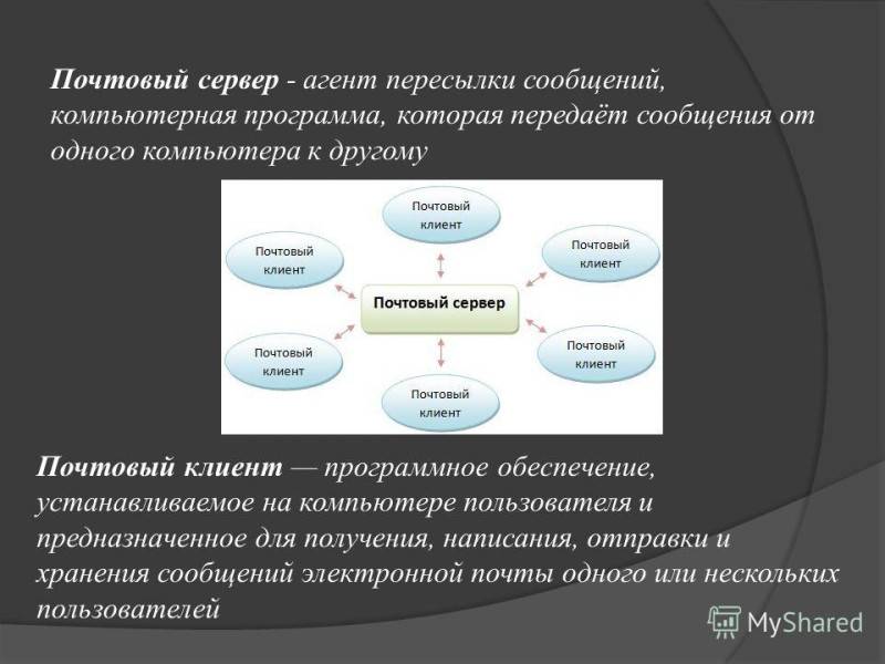 Почтовый сервер – агент пересылки сообщений, компьютерная программа, которая передаёт сообщения от одного компьютера к другому Почтовый клиент программное обеспечение, устанавливаемое на компьютере пользователя и предназначенное для получения, написания, отправки и хранения сообщений электронной почты одного или нескольких пользователей